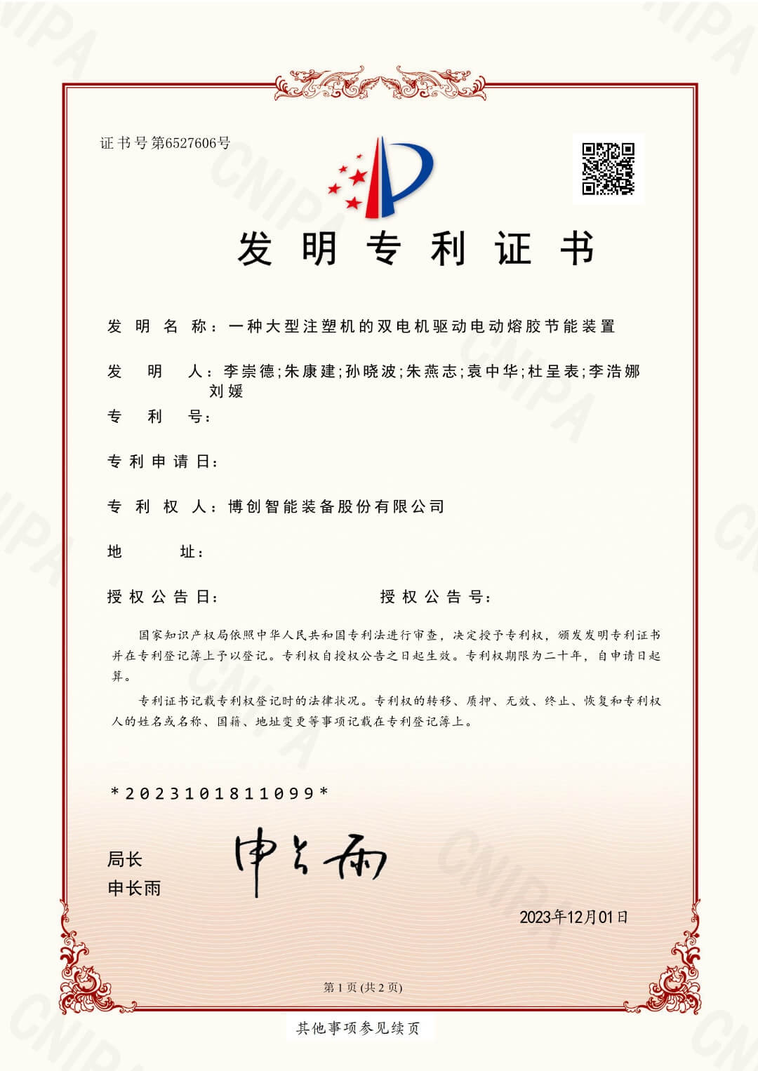 近期,博創榮獲國家發明專利《一種大型注塑機的雙電機驅動電動熔膠節能裝置》,專利號為:ZL 2023 1 0181109.9。
