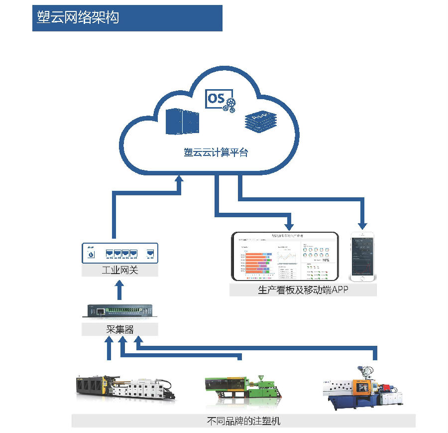 “塑云MES”系統(tǒng),適用于注塑工廠的生產管理與設備管理,為注塑企業(yè)用戶提供了一個行業(yè)內的注塑云平臺,基于此平臺實現(xiàn)對注塑機生產數(shù)據(jù)合理優(yōu)化匹配,對注塑生產實現(xiàn)信息化管理的一個高效信息化系統(tǒng)。注塑裝備通過“塑云MES”上云上平臺,實現(xiàn)互聯(lián)互通,形成真正的注塑工業(yè)物聯(lián)網(wǎng)。設備管理者可以在互聯(lián)網(wǎng)上隨時隨地查看設備狀況,同時采集數(shù)據(jù),以供ERP、MES等信息化系統(tǒng)使用。